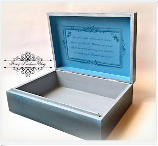 Z tego względu iż kocurek jest uchwycony na tle deszczowej niebieskiej szyby podobne kolory przeniosłam na boki szkatułki.